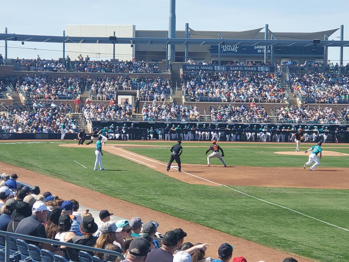 It ain’t over til the bat baby swings. All five of them. Seattle carried a 6-3 lead into the ninth inning. Cue the heroics-in-waiting. A Joey Wiemer single and Tyler Tolbert homer made it 6-5. Jac Caglianone singled and Gavin Cross tripled him home. 6-6. The comeback was complete when Stone Russell singled home Cross to make the final 7-6. Full confession: I was in the team store buying a cap and t-shirt during the four-run rally. Hey, the spring training fashion line was calling.