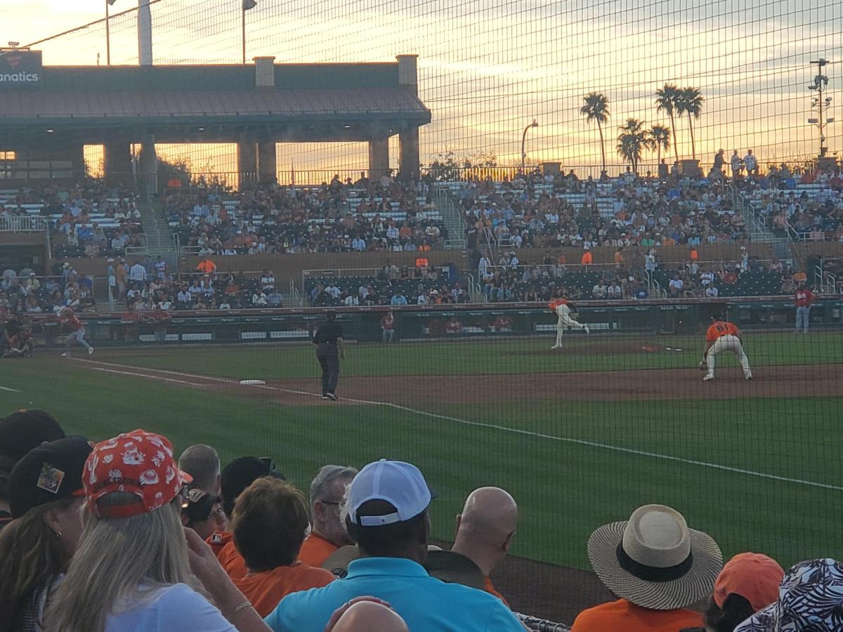 Ballpark Buzz … McLain’s triple in the first was three feet short of being a home run, banging off the Rose Paving sign in left. … Benson showed off his blazing speed in the fifth when he scored from first on Lowe’s line drive double to center. A positive for the Giants was the pitching staff’s 13 K’s on the day. Roupp had 4 in 3 innings, Erik Miller and Blade Tidwell each logged 3 in an inning each and Nick Margevicius recorded 3 in 4 innings of work. In the other dugout, Reds pitchers logged 9 K’s with Hagen Danner the sharpest, striking out all three batters he faced. … Roupp’s fastball hit 93.5 mph. … Scottsdale Stadium’s scoreboard is so busy, the text gets smaller and I may need to bring some binocs next time. … Attendance: 8,649. … My drink of choice today: Estrella and Sprite shanty.
